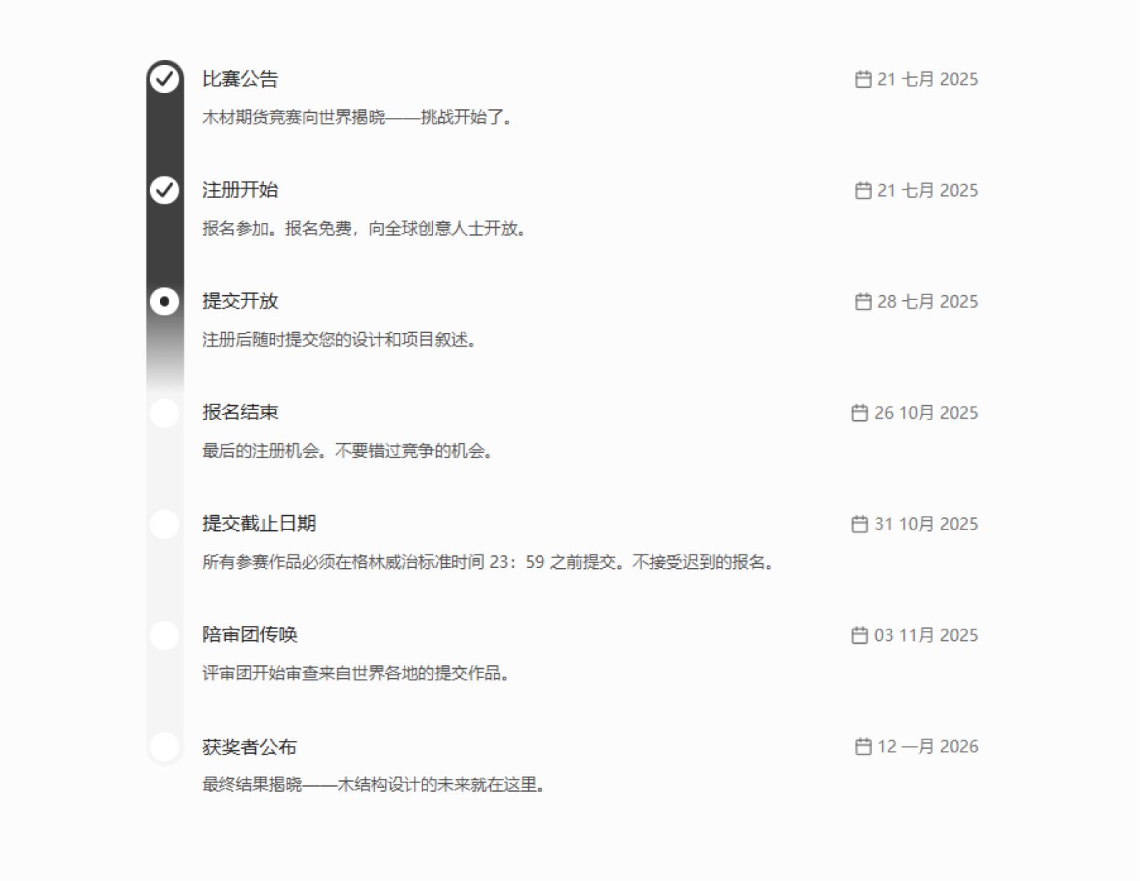 核心要求参赛者以木材为设计驱动力,探索其在可持续建筑领域的创新应用,设计项目中至少 50% 的结构系统需采用木材,选址可自由选择真实或虚拟场地,作品需呼应场地环境并结合木材纹理构思概念,同时思考木材在降低环境影响、改造社区空间、融合传统与现代技艺方面的价值,既允许重新挖掘过往创意,也鼓励全新创作。