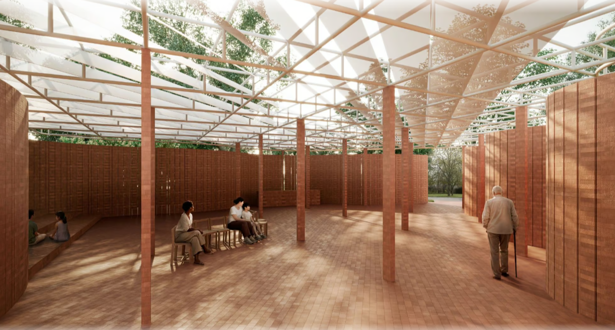 •一片砖砌的树林:屋顶轻盈地落在由砖块构成的柱子之上,这些柱子如同一片人造的树林,与公园的自然环境和谐共生,并与不远处的蛇形南画廊的砖砌立面遥相呼应。