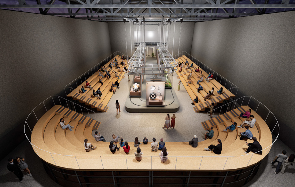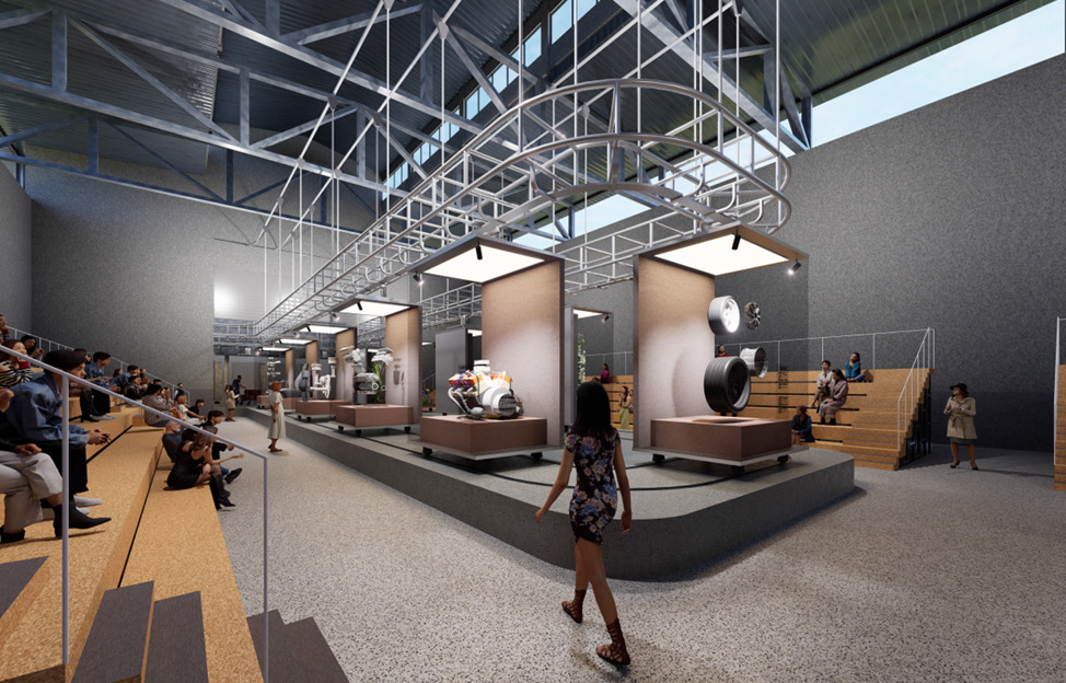 设计通过滑道系统带动标准展柜循环移动,使展品随展柜在T台前缓缓行进,打破了传统展览中“人动展品不动”的静态模式。这种动态陈列方式,既还原了工业遗址本身的“产线”记忆,也为观众营造出沉浸而流动的观展体验。观众无需移动,即可定点专注观察展品细节,从被动参观转变为主动感受者。
