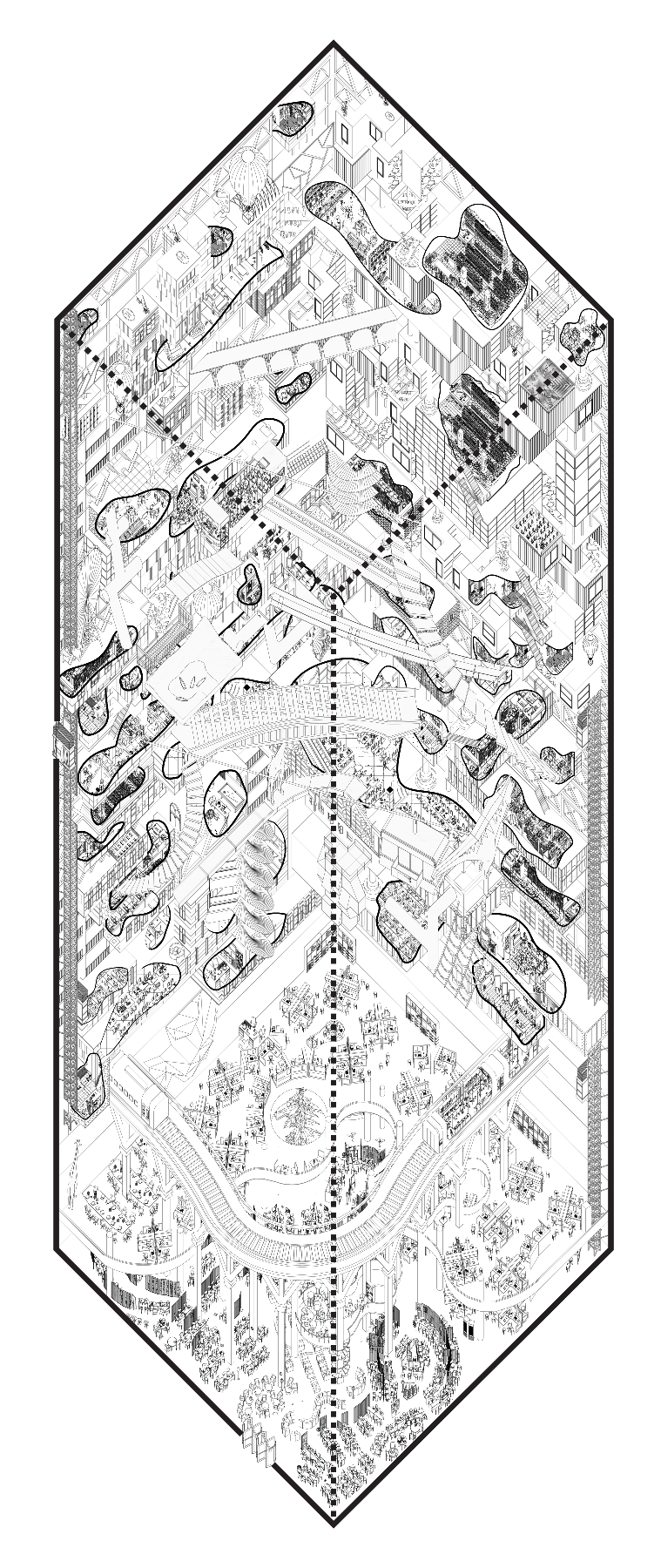 在这种普遍性与特殊性的矛盾下,毛磊和伙伴提出一种空间,它是不同可能的功能空间形状交叠的结果,对于不同的功能来说,它们共享的是这种交叠所产生的“空”空间本身,而在围绕这一空间的围合物上,提供了不同功能所需要的特殊元素,它们是片段的,共同存在的,也为“空”空间限定着不同的可能性。