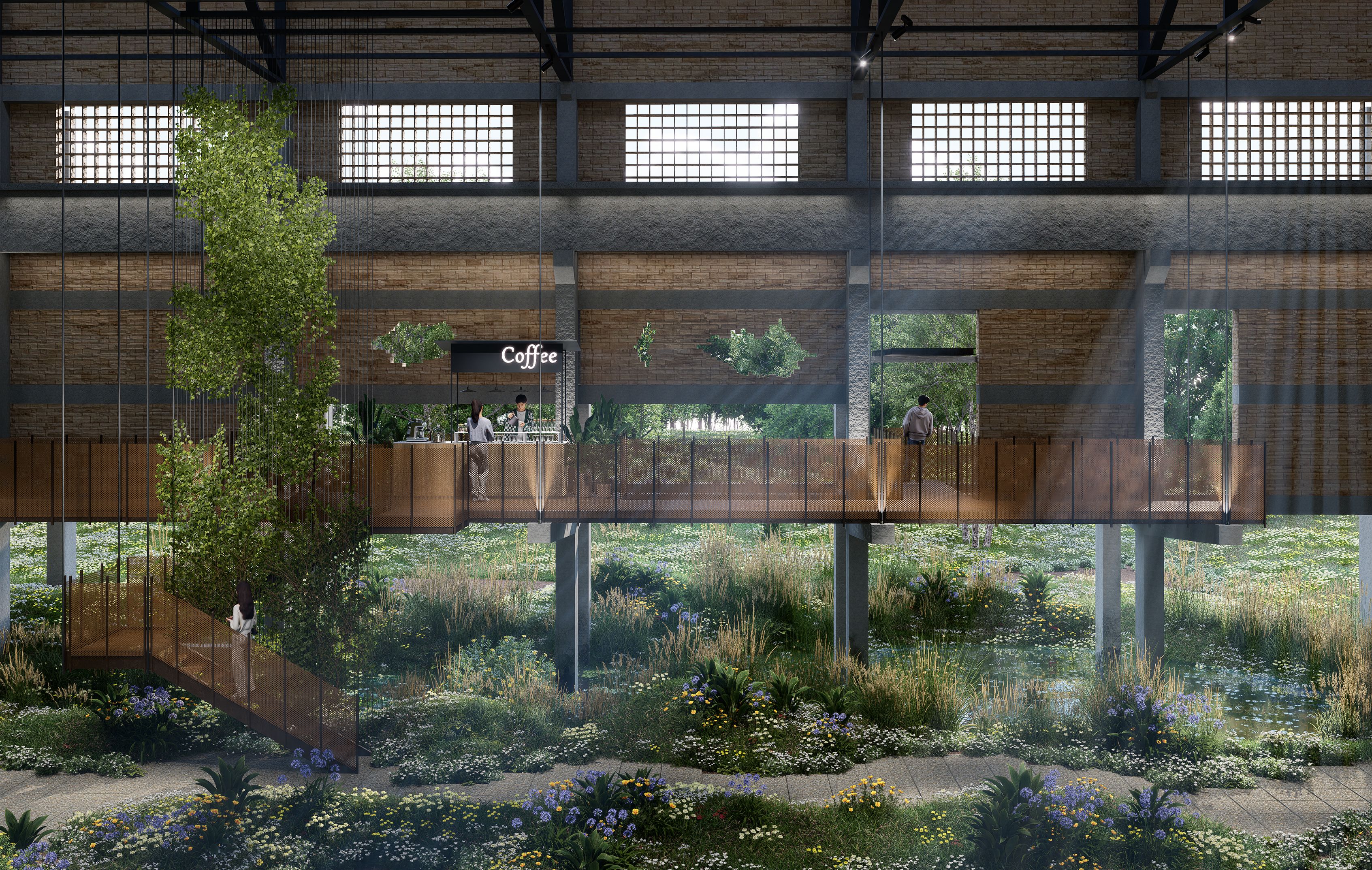 项目没有完全推倒重来,而是尝试用“轻介入”的方式唤醒场地的生命力。在原有厂房的一隅,设计了一个以水为媒介的观景平台,灵感来自场地内残存的水体。水与植物在这里成了空间的核心表达,它们和保留下来的钢结构、混凝土柱,还有那高挑开阔的空间静静对话,仿佛在工业废墟上悄悄生长出一片绿洲,带着种超现实的宁静,又透着股蓬勃的力量。这个项目从没想过要 “焕然一新”,而是想让旧物与新元素好好共存,让工业与自然达成和解。