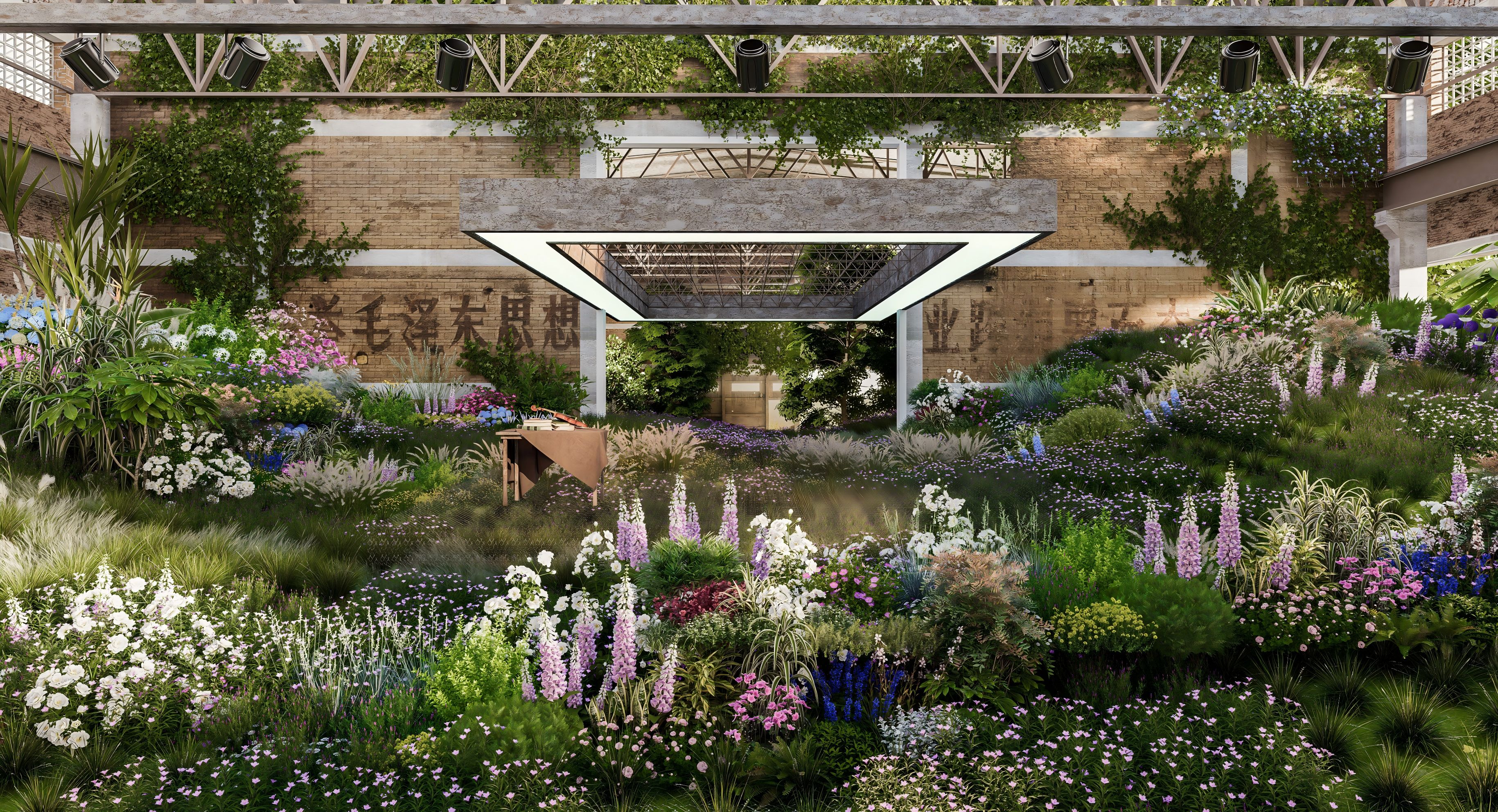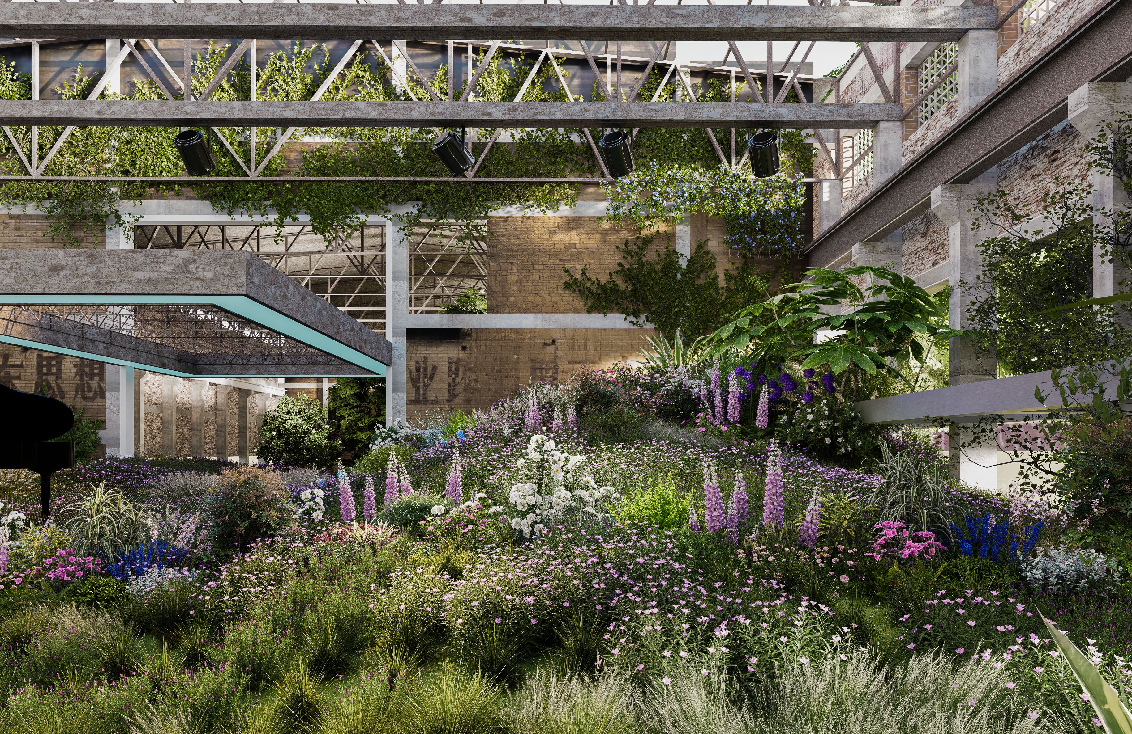 同时保留厂房钢架、墙缝等工业基底,让绿植沿结构生长,形成“工业骨架裹着绿色植被”的独特形态,既修复生态又留住场地记忆。